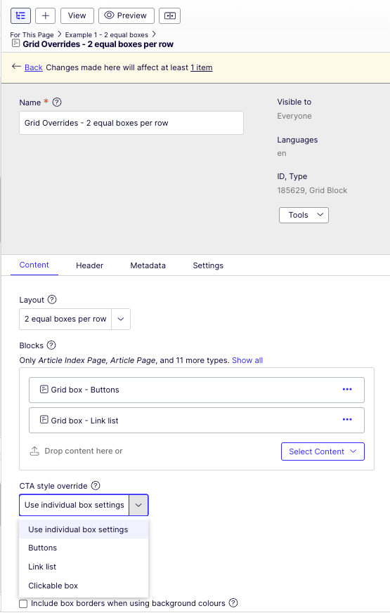 If the “CTA style override” option is set to anything else, the boxes and pages added to the grid are not showing their individually set CTA styles, but the style set on the Grid itself.